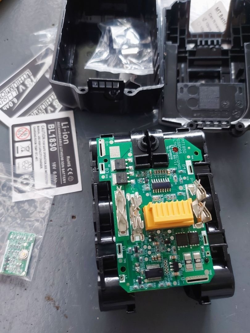 Replacement spare parts for Makita BL1830 6.0AH 18V Battery Pack, including outer battery box shell, BMS, battery holder, nickel strip, power indicator board, and screws.